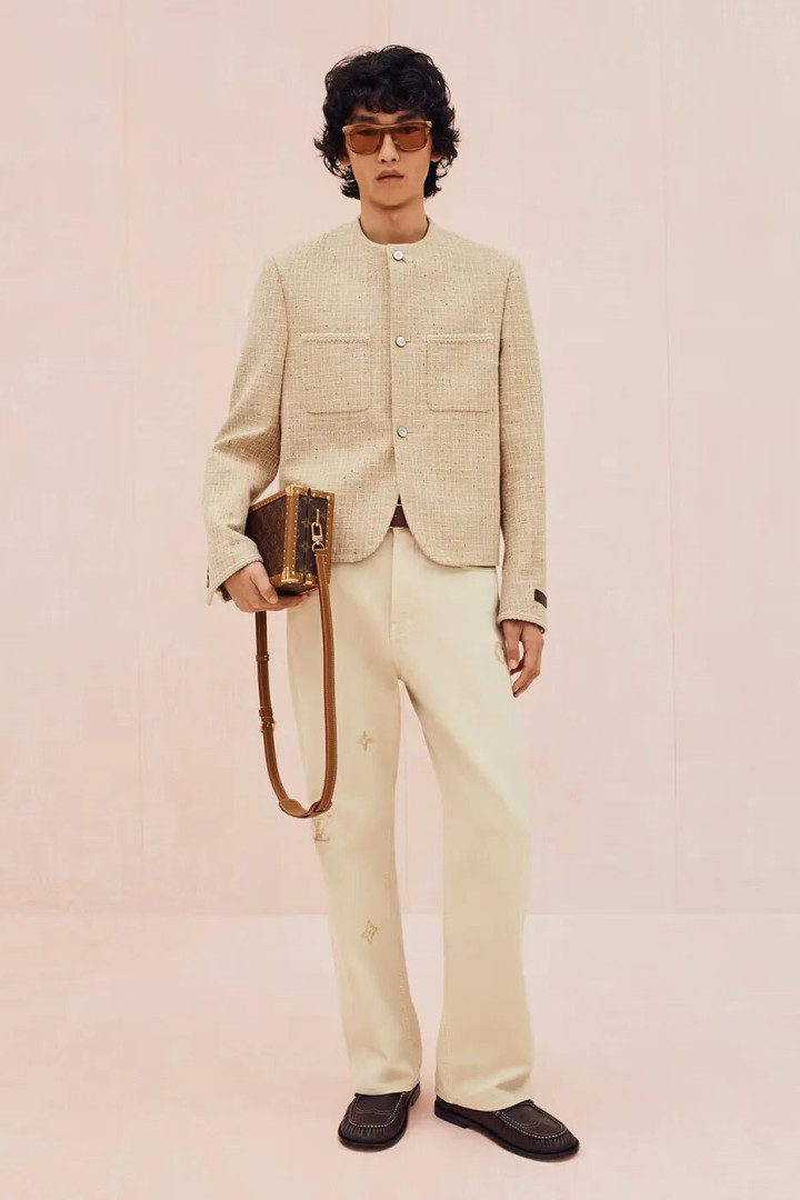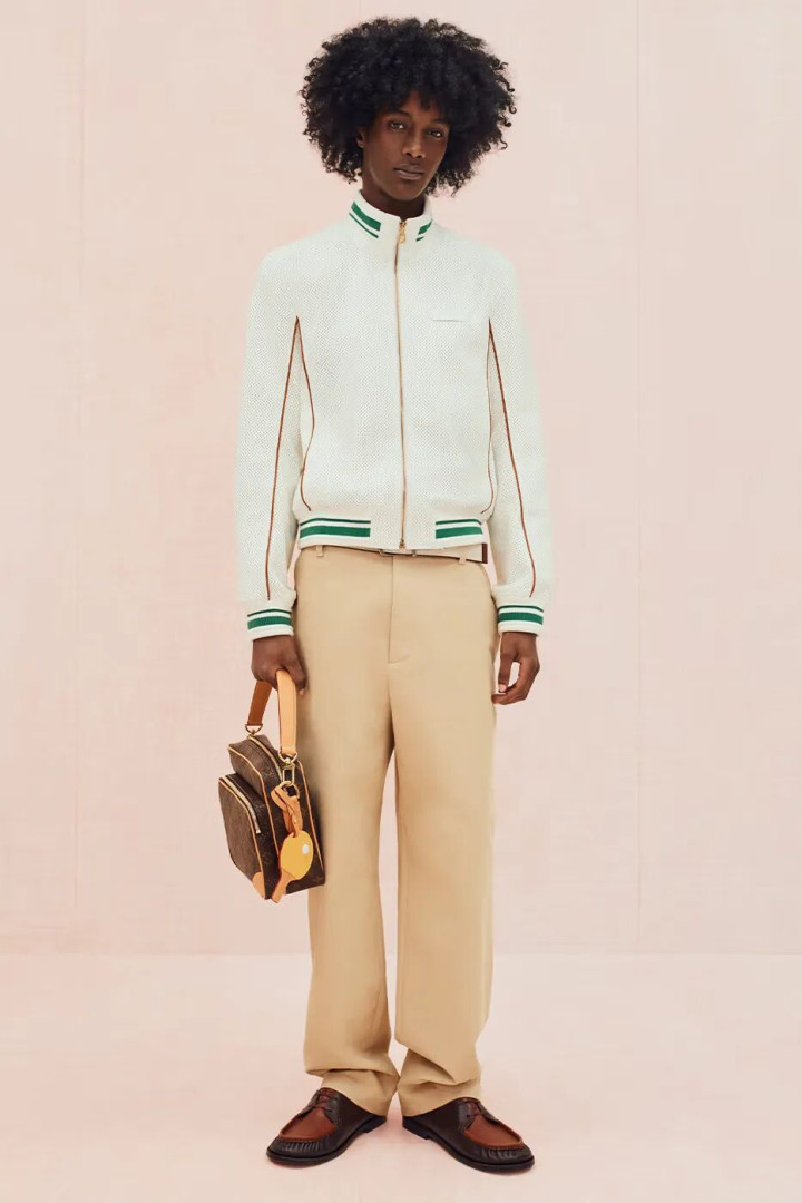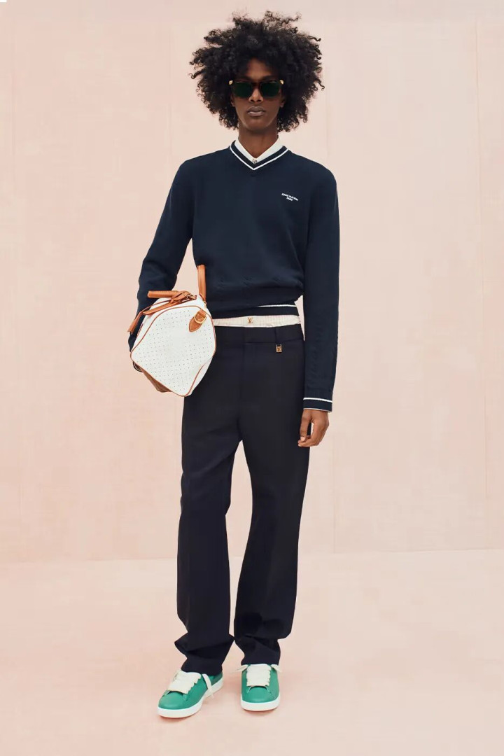 外套是本次系列的重点之一。设计包括采用 Prince of Wales Monogram 格纹的机能连帽 Blouson,以及质感粗犷的 Monogram Surplus 单品。偏向夏季的部分则带来轻盈剪裁,例如宽松亚麻西装、四角短裤与家居服,其中部分款式以条纹丝质提花面料制成。配饰呼应公园主题,亮点包括附可拆式网球拍套的 Keepall、乒乓球拍斜背袋,以及以 Classic Monogram 帆布制作的牛奶纸盒造型手袋。鞋履从以拼布牛仔呈现的大胆 LV Tilted 球鞋,到线条俐落的 LV Soft 球鞋一应俱全,为系列收笔于兼具精致质感与日常实穿的平衡点。